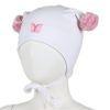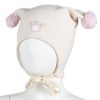 Myk vårlue med to runde dusker. Luen dekker ørene godt, har vindstopper, knyting under haken.