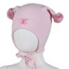 Myk vårlue med to runde dusker. Luen dekker ørene godt, har vindstopper, knyting under haken.