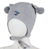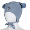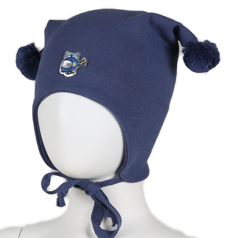 Myk vårlue med to runde dusker. Luen dekker ørene godt, har vindstopper, knyting under haken.