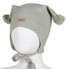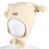 Myk vårlue med to runde dusker. Luen dekker ørene godt, har vindstopper, knyting under haken.