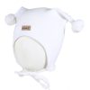 Myk vårlue med to runde dusker. Luen dekker ørene godt, har vindstopper, knyting under haken.