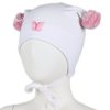 Myk vårlue med to runde dusker. Luen dekker ørene godt, har vindstopper, knyting under haken.