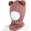 Myk vårlue med to runde dusker i kontrastfarge. Luen dekker ørene godt, har windstopper, knyting under haken og krone i pannen.