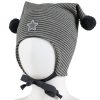 Myk vårlue med to runde dusker i kontrastfarge. Luen dekker ørene godt, har windstopper, knyting under haken og krone i pannen.