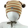 Myk vårlue med to runde dusker. Luen dekker ørene godt, har windstopper, knyting under haken og rev i pannen.