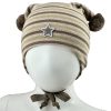 Myk vårlue med to store runde dusker. Luen sitter godt, har windstopper og knyting under haken.