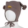 Myk vårlue med to runde dusker. Luen dekker ørene godt, har windstopper, knyting under haken.