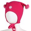 Myk vårlue med to runde dusker. Luen dekker ørene godt, har windstopper, knyting under haken.