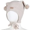 Myk vårlue med to runde dusker. Luen dekker ørene godt, har windstopper, knyting under haken.