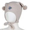 Myk vårlue med to runde dusker. Luen dekker ørene godt, har vindstopper, knyting under haken.