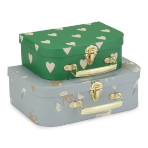 Sett med to nydelige lekekofferter i papp med metallhåndtak – perfekt til små skatter, leker og favoritting! Den minste kofferten passer inni den største, slik at de enkelt kan stables og oppbevares sammen.