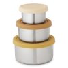 Fint sett med 3 bokser i rustfritt stål med lokk i silikon. Perfekt for frukt, snacks, lunch, leftovers fra gårsdagens middag for å nevne noen! De små boksene passer i de større boksene.