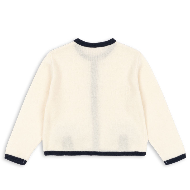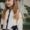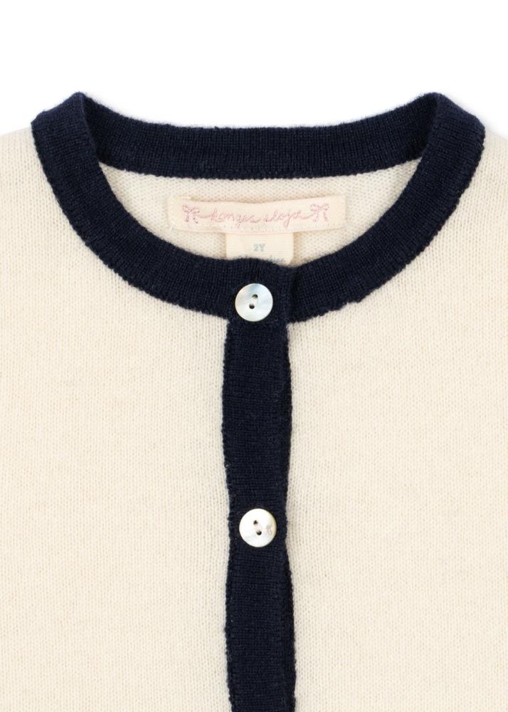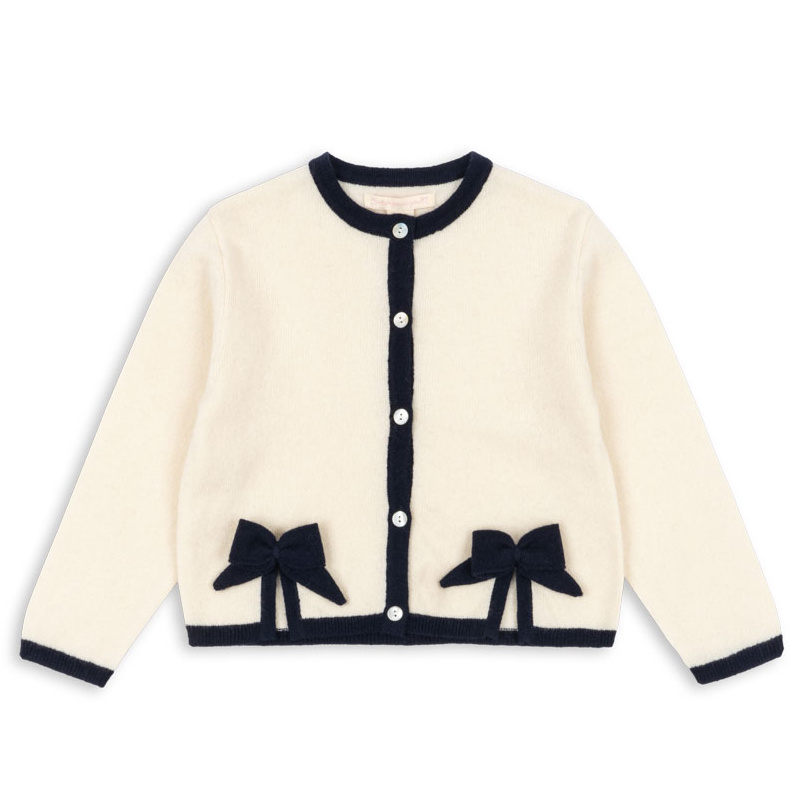 En myk og elegant cardigan i 100% ull, designet med rund hals, kontrastkanter og delikate perlemorsknapper foran. De søte sløyfedetaljene gir plagget et tidløst og feminint preg.