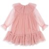En nydelig tyllkjole fra Konges Sløjd i en myk og luftig kvalitet. Kjolen har en dekorativ sløyfe foran og en søt krage som gir et elegant og klassisk uttrykk. Den lange, løse passformen gjør den behagelig å ha på, mens det myke bomullsfôret sørger for ekstra komfort mot huden.