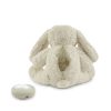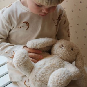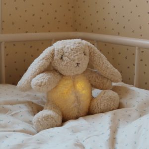 Myk interaktiv bunny nattlampe i resirkulert plysj, med svakt lys og en beroligende glød. Den interaktive teddylampen er designet med en innebygd oppladbar Bluetooth-høyttaler som lar barna lytte til sanger, lyder og innhold som godnatt-historier. LED-lys og bluetooth-boks er skjult inne i et rom med glidelås bak.