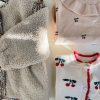 Lun og myk strikkejakke i 100% økologisk bomull, bølgeformede kanter og perlemorsknapper.