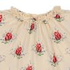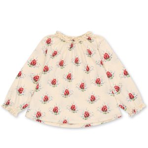 Myk bluse designet med et utsvingt snitt og en elastisk volangutringning og volangdetaljer rundt de elastiske mansjettene.