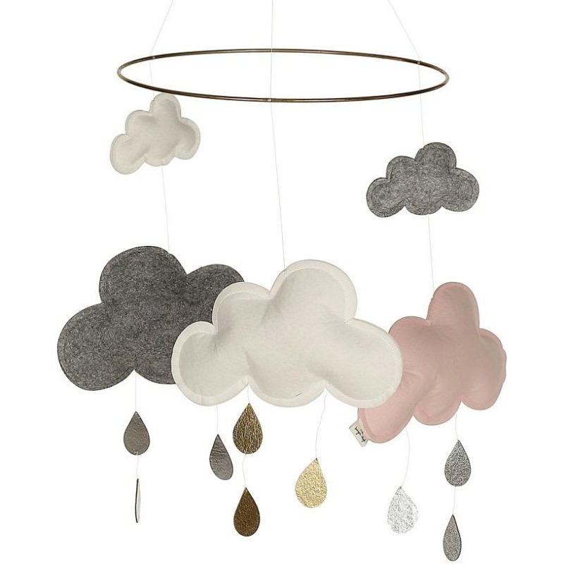 Vakker uro med skyer i kraftig filt og dråper i gull og sølv. Svever magisk i en gjennomsiktig tråd.