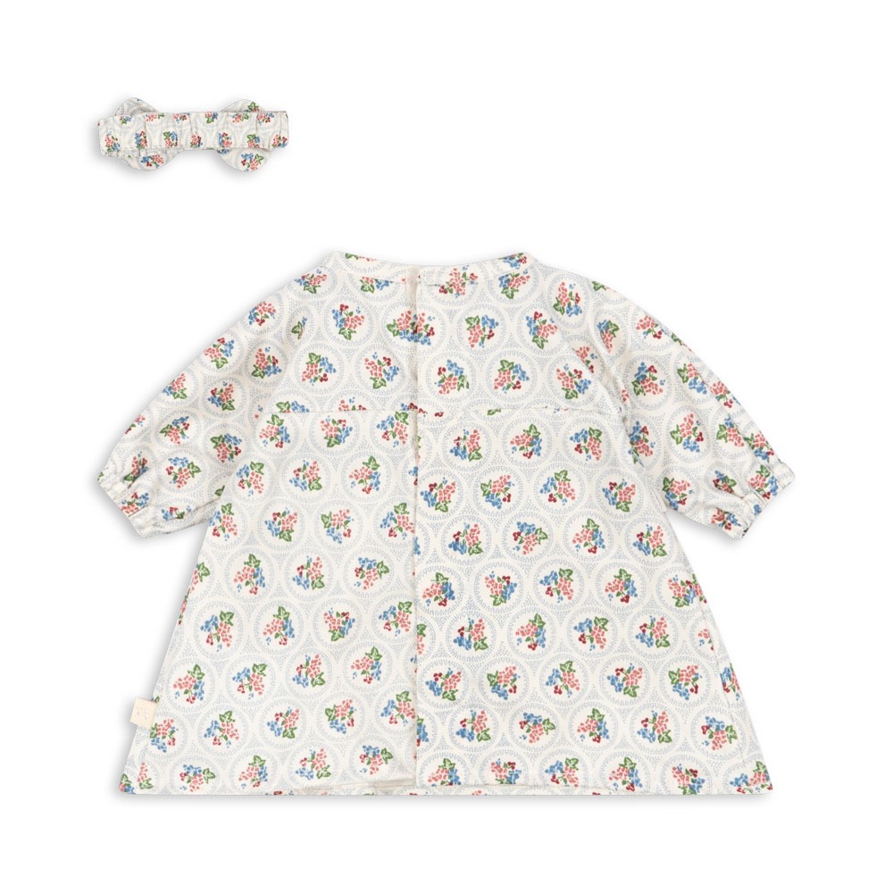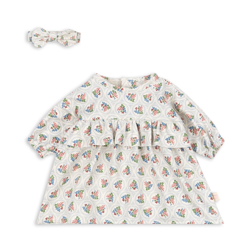 Sett til dukken i myk bomull som består av kjole og hodebånd. Passer Alfie og Gerd.