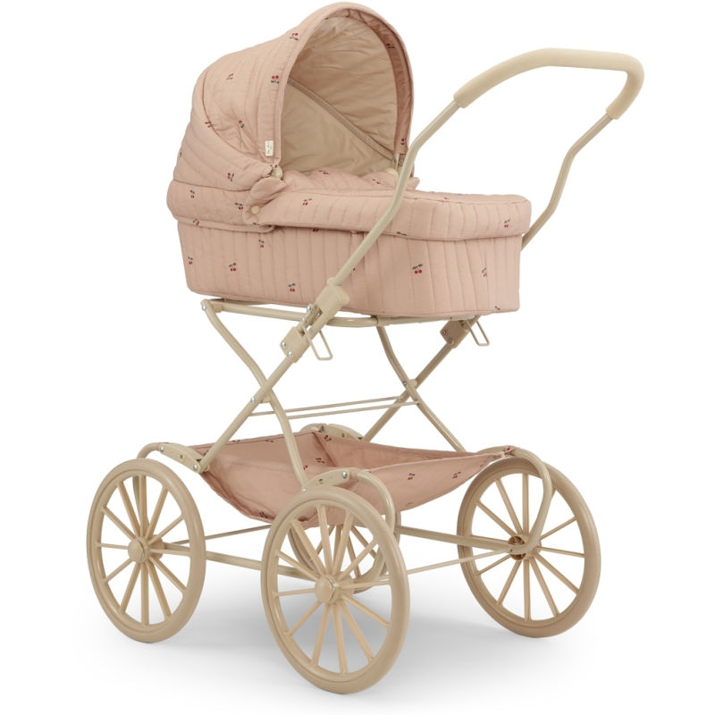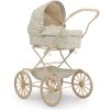 Dukkevogn i vintage stil designet med fire store hjul laget i EVA-materiale for ekstra stabilitet. Har quiltet trykt stoff og en madrass laget av 100% økologisk bomull. Designet med en mykt polstret oppbevaringskurv under liggedelen. Rammen er laget av metall med mykt håndtak. Dukkevognen kommer ferdig montert og er enkel å slå sammen og oppbevare.