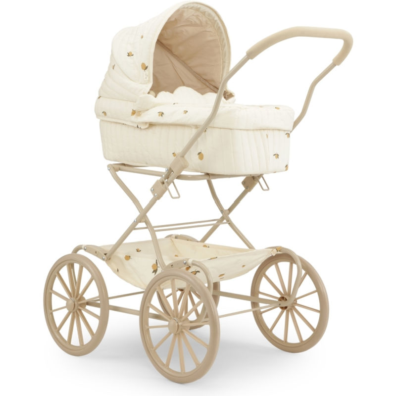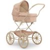 Dukkevogn i vintage stil designet med fire store hjul laget i EVA-materiale for ekstra stabilitet. Har quiltet trykt stoff og en madrass laget av 100% økologisk bomull. Designet med en mykt polstret oppbevaringskurv under liggedelen. Rammen er laget av metall med mykt håndtak. Dukkevognen kommer ferdig montert og er enkel å slå sammen og oppbevare.