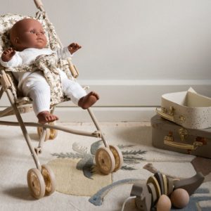 Skjønn paraplytrille til dukken eller bamsen, perfekt for koselige trilleturer inne eller ute. Trillen har sele, liten vognbag og doble hjul på alle fire ben for ekstra stabilitet. Stoffdelen er avtagbar og enkel å vaske ved behov. Rammen er laget av jern med myke, svampete håndtak som gir godt grep. Vognen leveres ferdig montert og kan enkelt slås sammen og oppbevares.