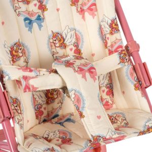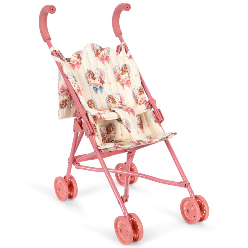 Skjønn paraplytrille til dukken eller bamsen, perfekt for koselige trilleturer inne eller ute. Trillen har sele, liten vognbag og doble hjul på alle fire ben for ekstra stabilitet. Stoffdelen er avtagbar og enkel å vaske ved behov. Rammen er laget av jern med myke, svampete håndtak som gir godt grep. Vognen leveres ferdig montert og kan enkelt slås sammen og oppbevares.