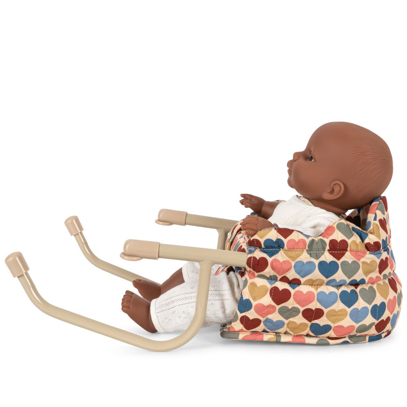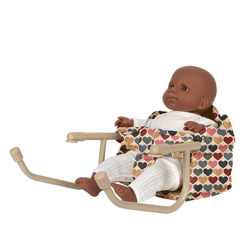 En herlig stol for dukker og bamser – perfekt til koselige måltider ved bordet. Stolen festes enkelt på bordplaten og er laget i quiltet økologisk bomull med dekorative bølgekantede detaljer. Den solide rammen i jern sørger for stabilitet, mens den myke polstringen gjør stolen behagelig for dukken eller bamsen.