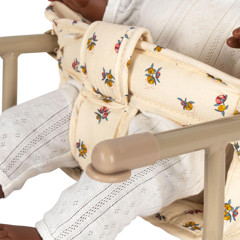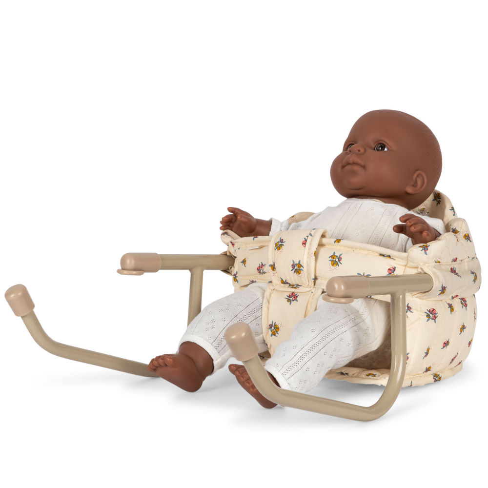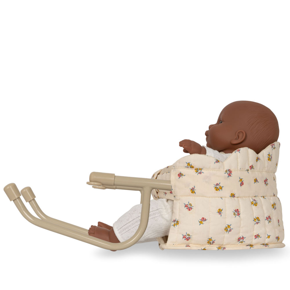 En herlig stol for dukker og bamser – perfekt til koselige måltider ved bordet. Stolen festes enkelt på bordplaten og er laget i quiltet økologisk bomull med dekorative bølgekantede detaljer. Den solide rammen i jern sørger for stabilitet, mens den myke polstringen gjør stolen behagelig for dukken eller bamsen.