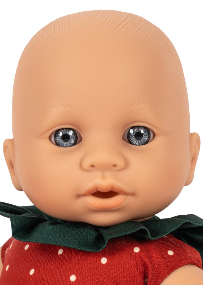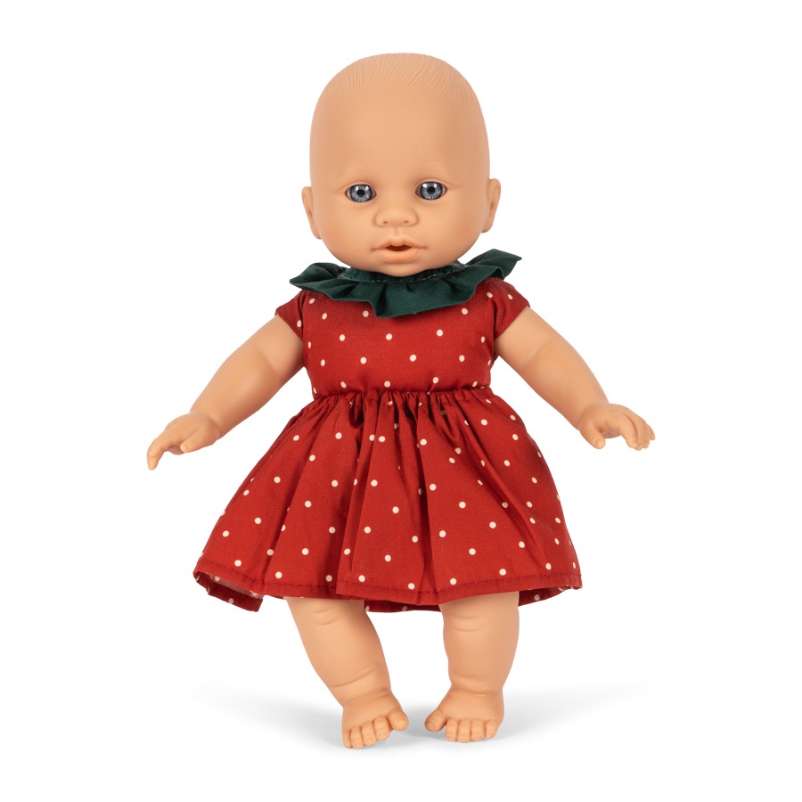 Søt babydukke i jordbærkjole – perfekt for kos og fantasifull lek. Fraise baby doll har en myk og fleksibel kropp som gjør den enkel å kle på og leke med.