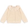 Nydelig strikket cardigan i myk bomullsblanding med avrundet krage og delikat hullstrikkmønster. Den skimrende tråden gir et hint av glitter som gjør den perfekt både til hverdags og fest.