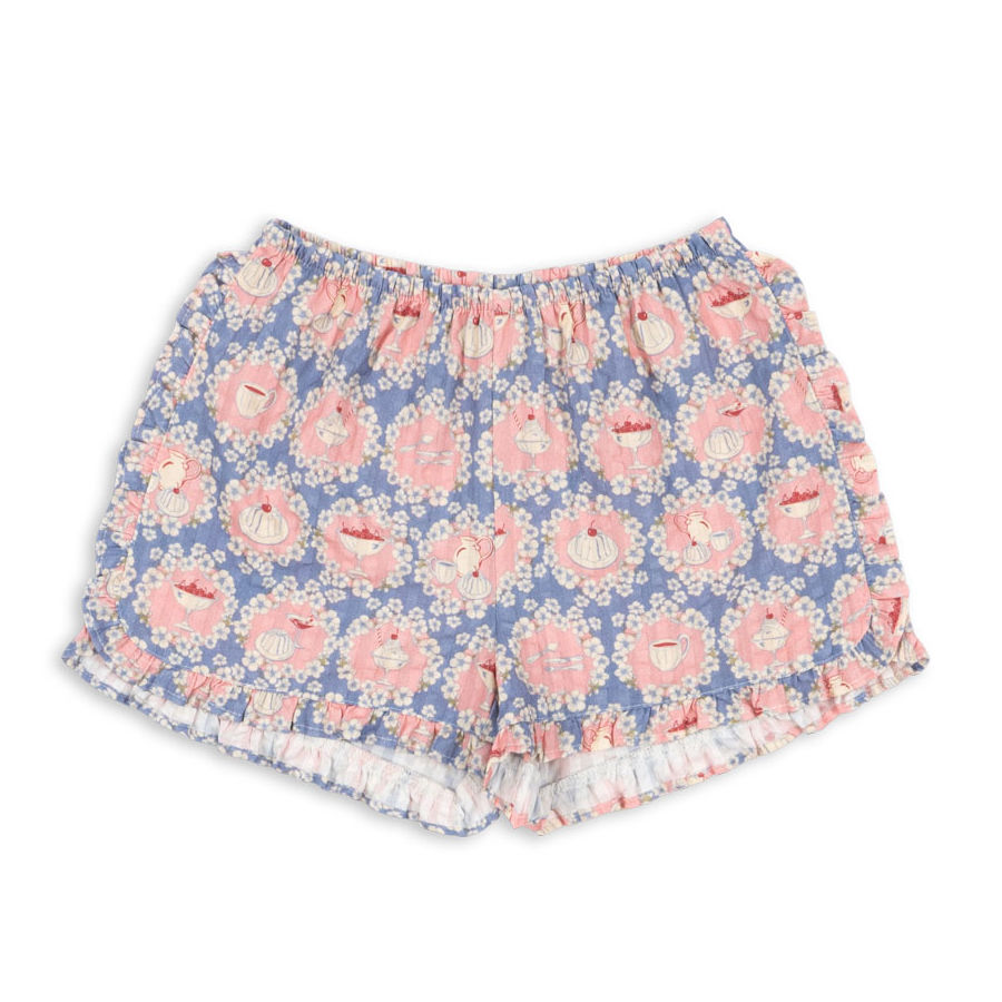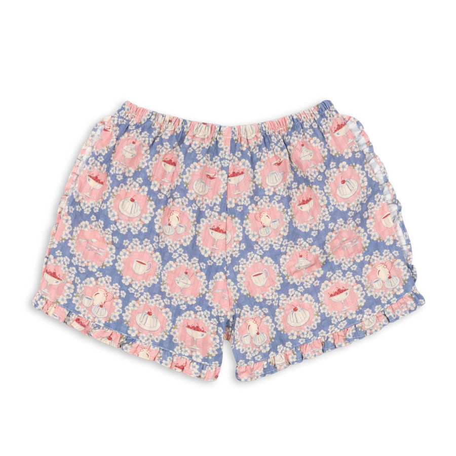 Myke og luftige shorts i pustende økologisk bomull med seersucker-struktur. Shortsen har en løs og behagelig passform, elastisk midje og søte volangkanter som gir et sommerlig uttrykk.