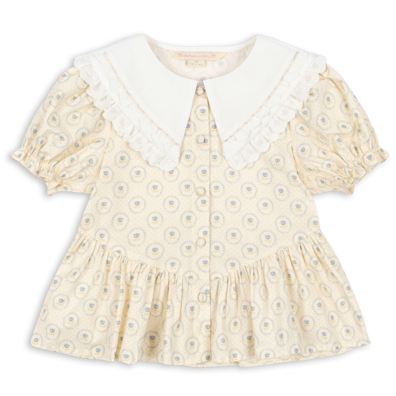 Sommerlig bluse i økologisk bomull med blondkrage og puffermer.