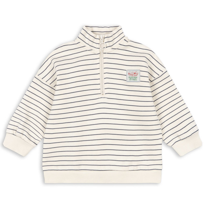 Myk og komfortabel sweatshirt i økologisk bomullsblanding med et klassisk stripet uttrykk. Lou-sweatshirten har halv glidelås og høy krage som gjør den enkel å ta av og på, og perfekt til både hverdag og lek.