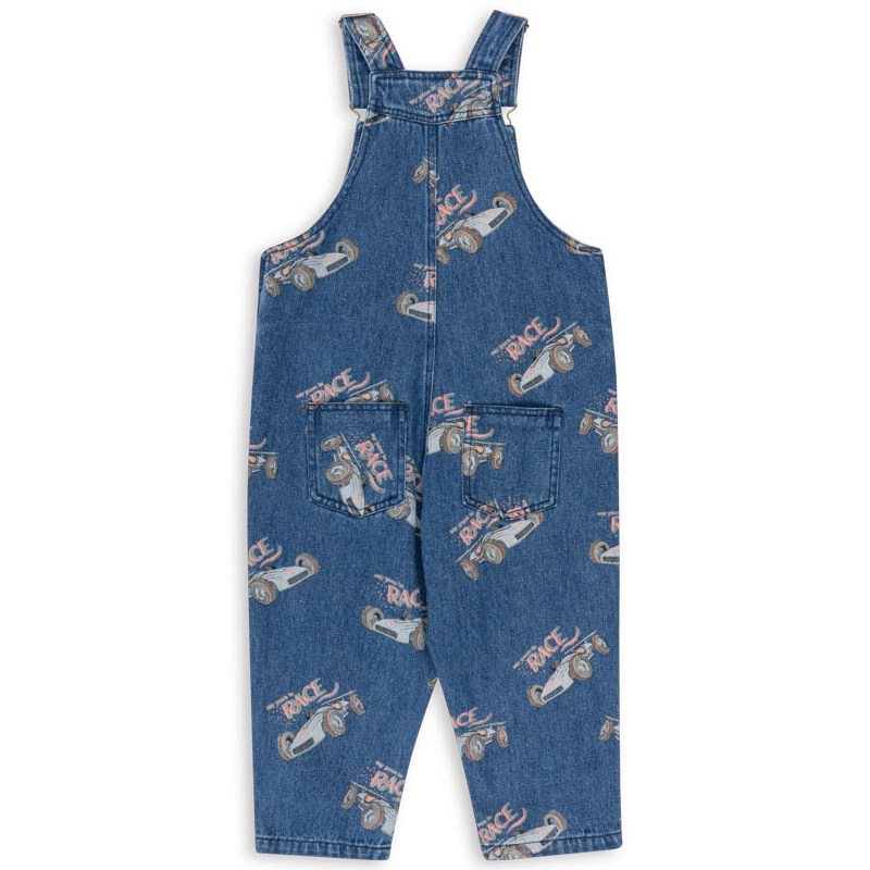 Myk denimoverall med signaturlogoknapper. Har trykt stoff på innsiden av den øvre delen.