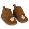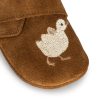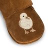 Supersøte skinntøfler til de minste i semsket skinn med brodert kylling. Ergonomisk form som er fint for voksende småføtter.