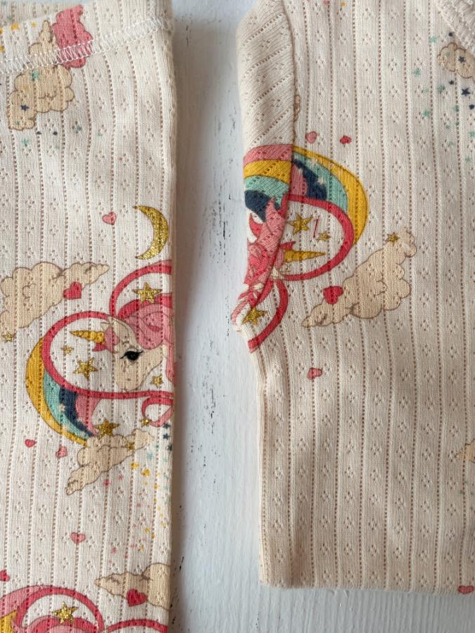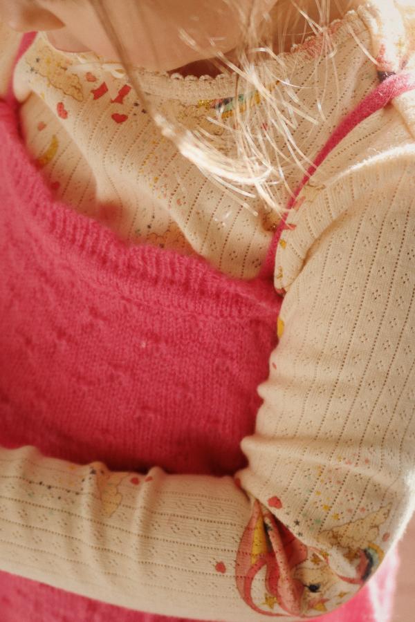 Myk bomullstopp med dekorativ pointelle og glitterprint. En myk og behagelig topp til kjoler og skjørt, samt jeans til hverdags.