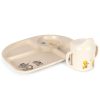 Settet inneholder en lekkasjesikker tutekopp og en praktisk tallerken med inndelte rom som gjør det enklere for barnet å utforske ulike smaker og konsistenser.