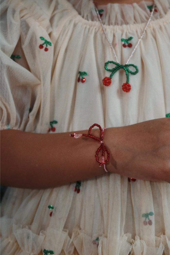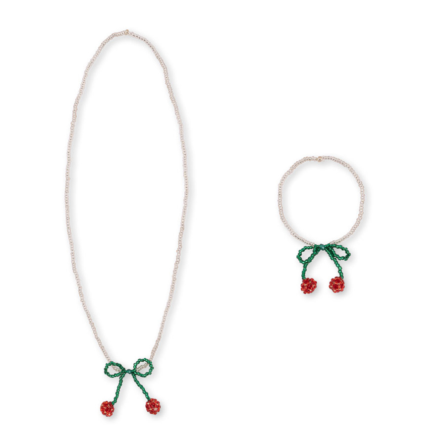 Et nydelig smykkesett som består av et perlekjede og et armbånd formet som kirsebærsløyfer. Perfekt for små som elsker å pynte seg og leke med accessories.