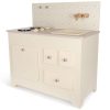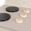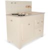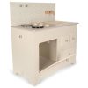 Lekekjøkken i tre designet med tre skuffer, en stekeovn, en vannkran, en vask, to kokeplater og dreibare knapper. Har tre knotter foran og en på siden. Lekekjøkkenet leveres med festbare vegghengere av sikkerhetsmessige årsaker.