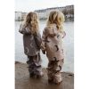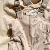 Superfint regnsett i en myk PU-kvalitet. Nye farger og mønster! Bukser med seler og strikk under bena så de sitter godt på barnet. Jakken har avtagbar hette, lommer og fleece i kraven. Jakken har glidelåser som er beskyttet med knapper for regn og vind. Størrelsen er normal/litt romslig (er du i tvil skal du ikke gå opp).