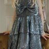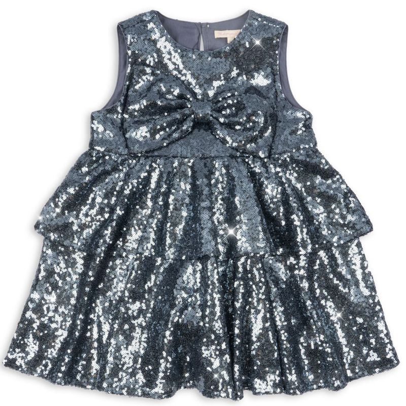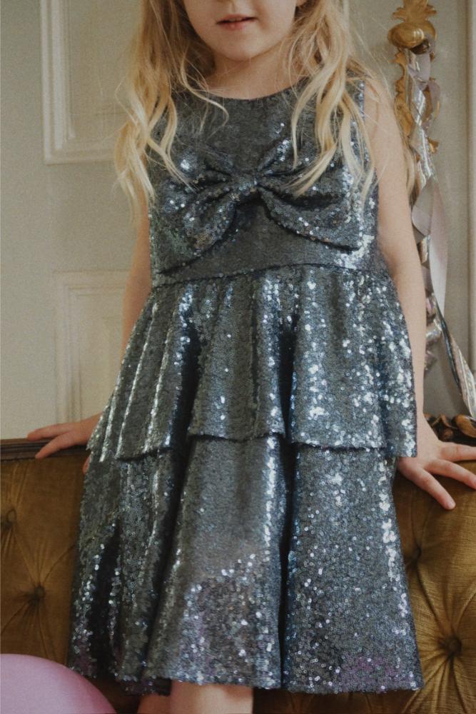 «Glitrende paljettkjole med stor sløyfe – perfekt til julefester og høytidens magiske øyeblikk.»