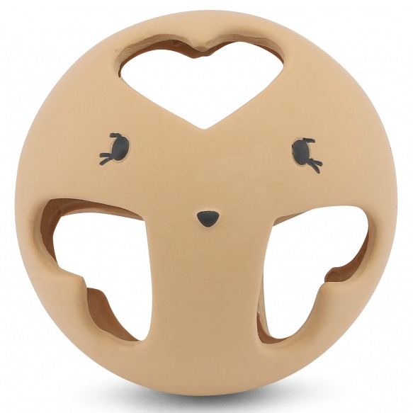 Søt ball i 100% naturlig Hevea gummi, perfekte når gommene klør eller som en leke. Ballens ulike overflater og åpninger stimulerer babyens sanser; syn, hørsel, lukt, berøring og smak. God å holde i og passer fint til små hender enten som en vanlig leke eller som en biteleke. Rengjøres med en fuktig klut eller med såpevann (maks 30 grader). Ikke bruk noen kjemikalier på gummileketøy.