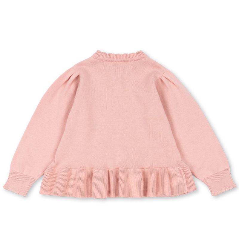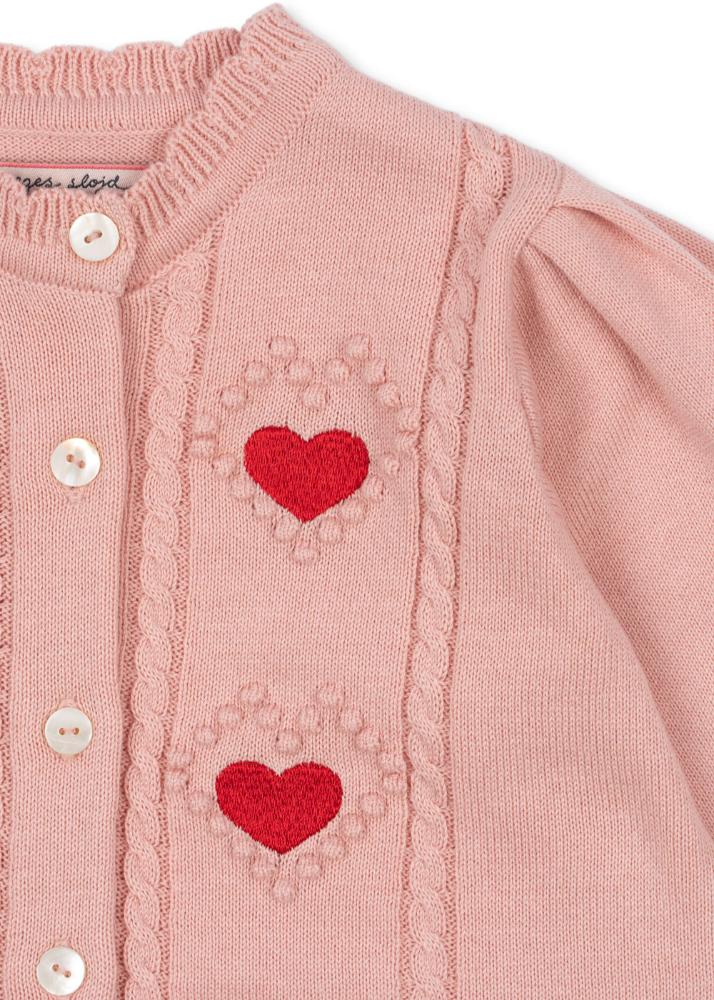En myk og feminin cardigan i 100% økologisk bomull. Designet med dekorative perlestrikkdetaljer, perlemorsknapper og voluminøse ballongermer for et lekkert uttrykk.