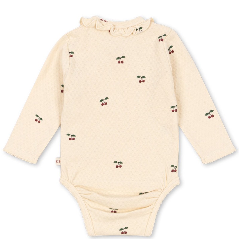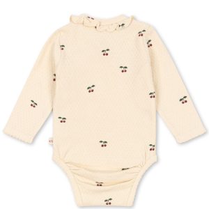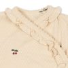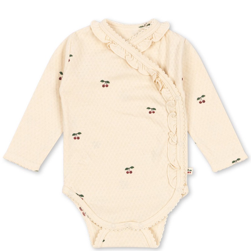 En myk og behagelig body i økologisk bomull, perfekt til de aller minste. Bodyen er designet med praktisk omslagslukking og søte volangdetaljer, samt trykknapper langs kroppen og nederst for enkel påkledning og bleieskift.