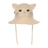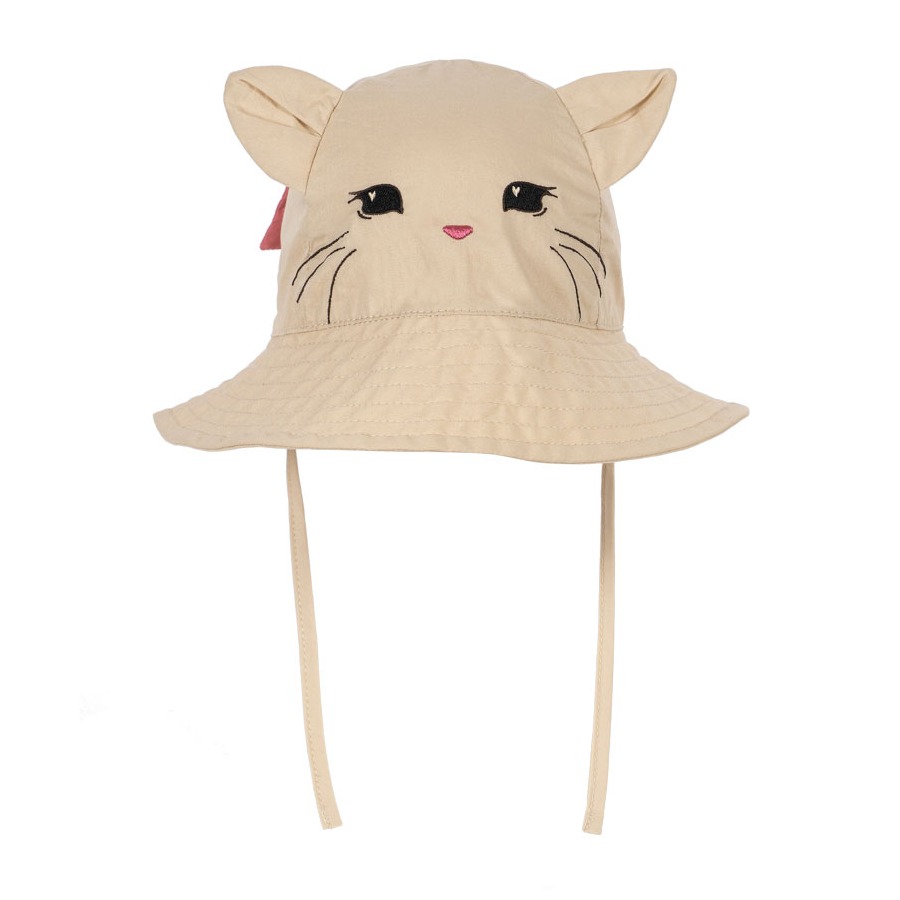 Myk og søt solhatt med katteansikt, små katteører på toppen og en dekorativ sløyfe bak. Hatten knytes under haken for å sikre god passform – perfekt på solrike dager.