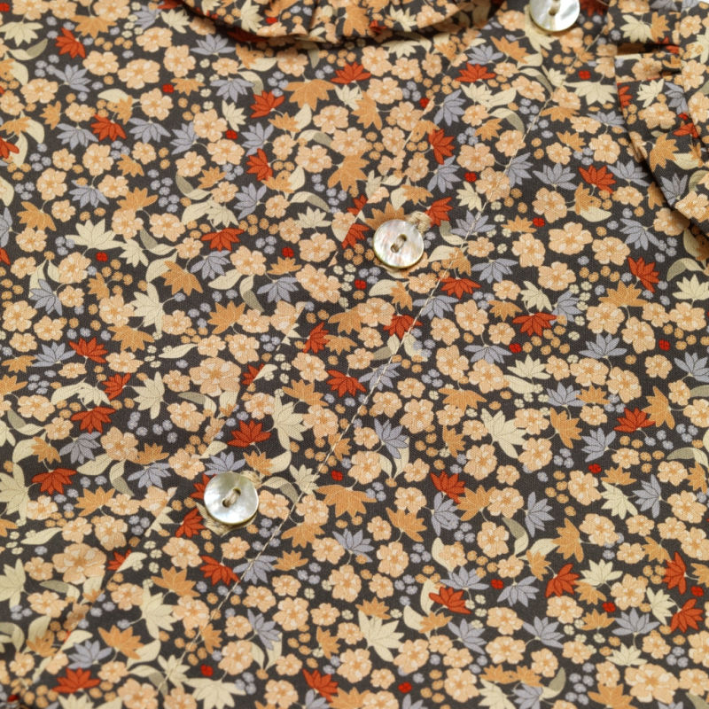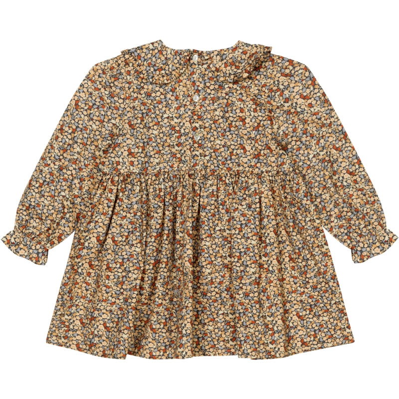Nydelig kjole i myk økologisk bomull. Rund krave og elastiske mansjetter. Elastikk i midjen og lukkes med 3 perlemorsknapper bak.