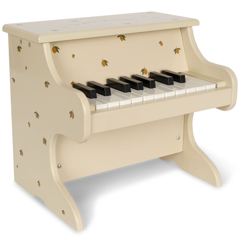 Høyglans miniatyrpiano laget av bærekraftig tre. Dekorert med skrift og Konges Sløjd signaturtrykk. Miniatyrpiano er godkjent for barn i en alder av +3 år. En liten treholder for noter følger med pianoet