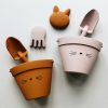 Det perfekte bøttesettet på tur! Myk silikonbøtte, 4 sandformer og spade. Formene kan til og med brukes til baking 🙂