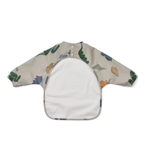 Praktisk smekke med armer og lomme som beskytter barnets klær mot søl. Smekken lukkes med 2 trykknapper i nakken, er vanntett og tørkes enkelt av etter bruk.